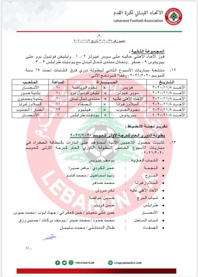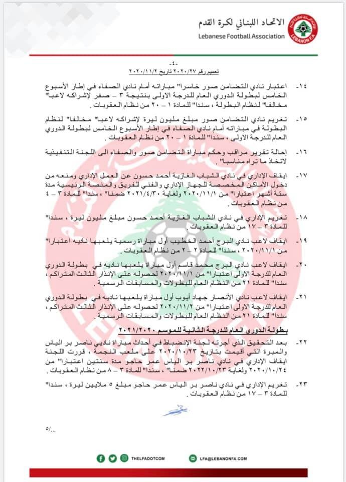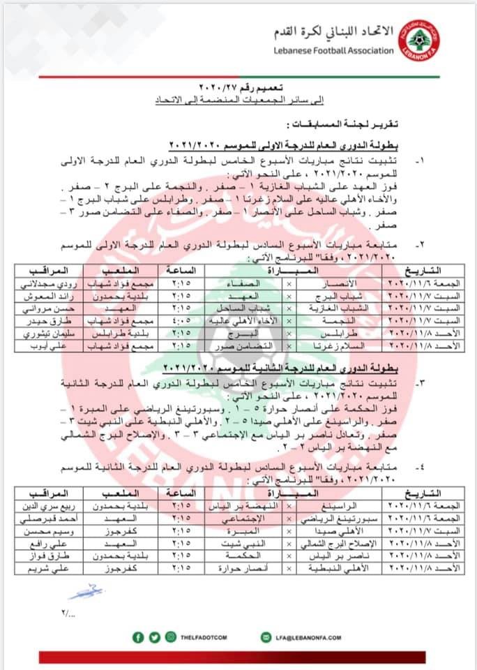قرر الإتحاد اللبناني لكرة القدم في اجتماعه الأسبوعي تثبيت نتائج مباريات المرحلة الخامسة من بطولتي الدرجتين الأولى والثانية , وتخسير نادي التضامن مباراته أمام الصفاء (3-0) بسبب مخالفته لنظام البطولة , ومتابعة مباريات الأسبوع السادس حسب التالي :