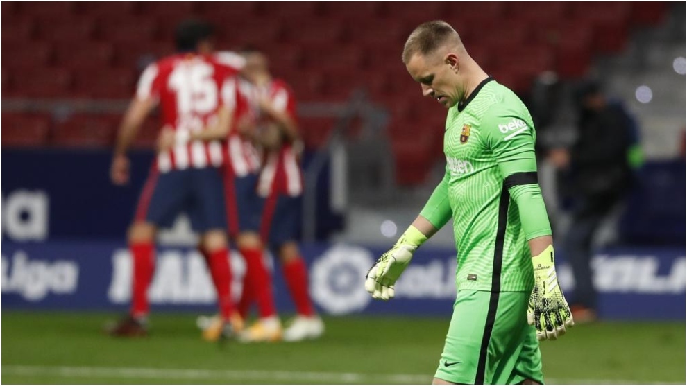 خيبة حارس برشلونة الألماني تير شتيغن بعدما تسبب بهدف أتليتيكو.