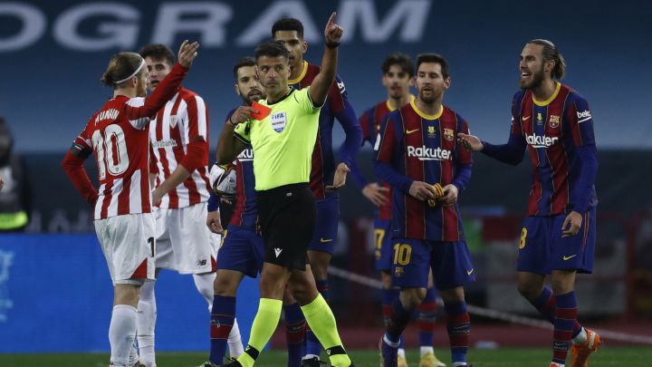 أوقف الإتحاد الإسباني لكرة القدم قائد برشلونة الأرجنتيني ميسي مباراتين بعد طرده في مباراة نهائي كأس السوبر التي خسرها برشلونة الأحد الماضي أمام أتليتيكو بلباو بنتيجة (3-2) بعد تمديد الوقت . ورفع الحكم جيل مانزانو البطاقة الحمراء في وجه ميسي في نهاية المباراة بعدما رصدت الكاميرا قيام ميسي بتوجيه صفعة للاعب أتليتيكو بلباو آسير فيلاليبري الذي يراقبه . وهي المرّة الأولى التي يُطرد فيها ميسي تحت ألوان برشلونة منذ ترفيعه إلى الفريق الأول عام 2005 . وبحسب القانون قد تتراوح عقوبة الإعتداء من مباراتين إلى 12 مباراة , لكن الإتحاد الإسباني اعتمد في حكمه على تقرير الحكم مانزانو المخفّف الذي لم يصف الحادثة بالإعتداء مما دفع برشلونة إلى استغلال هذه النقطة وتقديم استئناف .