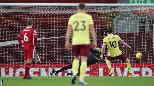 آشلي بارنز يسجل هدف بيرنلي في مرمى ليفربول من ضربة جزاء .
