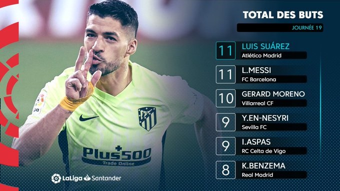 أما في الدوري فقد عزّز أتليتيكو مدريد من حظوظه للفوز بالبطولة هذا الموسم , بعدما قاده مهاجمه لويس سواريز في المباراة التي أجريت ليلاً في إطار المرحلة التاسعة عشرة , إلى الفوز على مضيفه أيبار بنتيجة (2-1) بتسجيله هدفي فريقه . ليدرك زميله السابق الأرجنتيني ميسي في صدارة ترتيب الهدافين برصيد 11 هدفاً . وهو الفوز السادس على التوالي لأتليتيكو ابتعد به في الصدارة بفارق سبع نقاط عن أقرب منافسيه ريال مدريد , ولأتليتيكو مباراة مؤجلة .