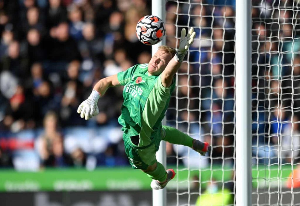 حارس مرمى الأرسنال رامسديل يصد ركلة حرّة في مباراة ليستر سيتي .