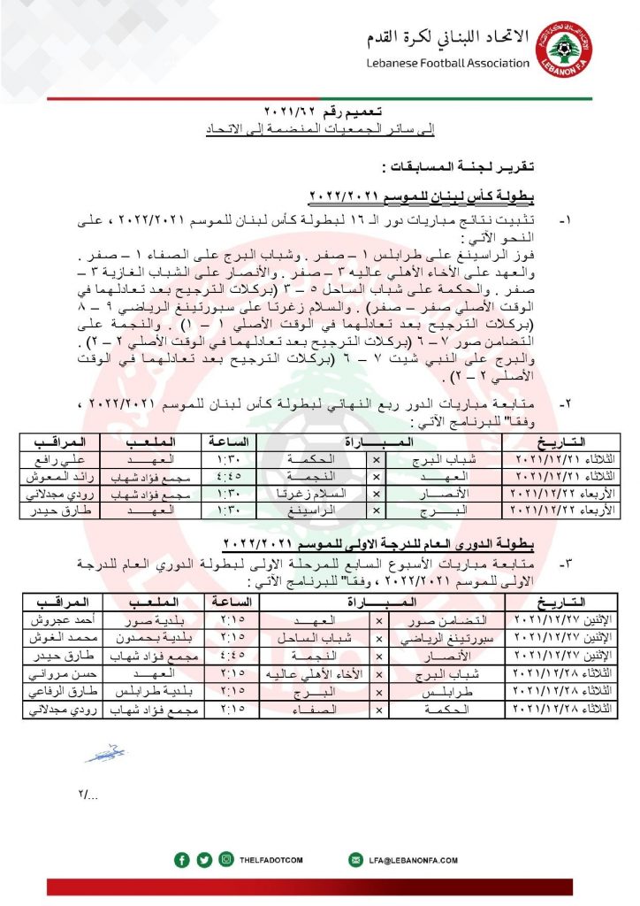 أعلن الإتحاد اللبناني لكرة القدم في ختام إجتماعه الأسبوعي أمس برنامج مباريات الدّور الربع نهائي من بطولة كأس لبنان الذي ينطلق ظهر اليوم بمباراة شباب البرج والحكمة , يليه مباراة القمّة بين النجمة والعهد مساءً . كما قرّر متابعة مباريات دوري الدرجة الأولى , بإقامة المرحلة السابعة التي تتضمن قمّة أخرى بين الأنصار والنجمة . وفيما يلي البرنامج :