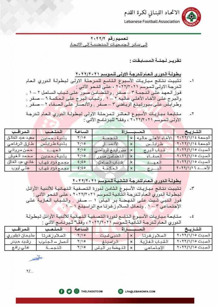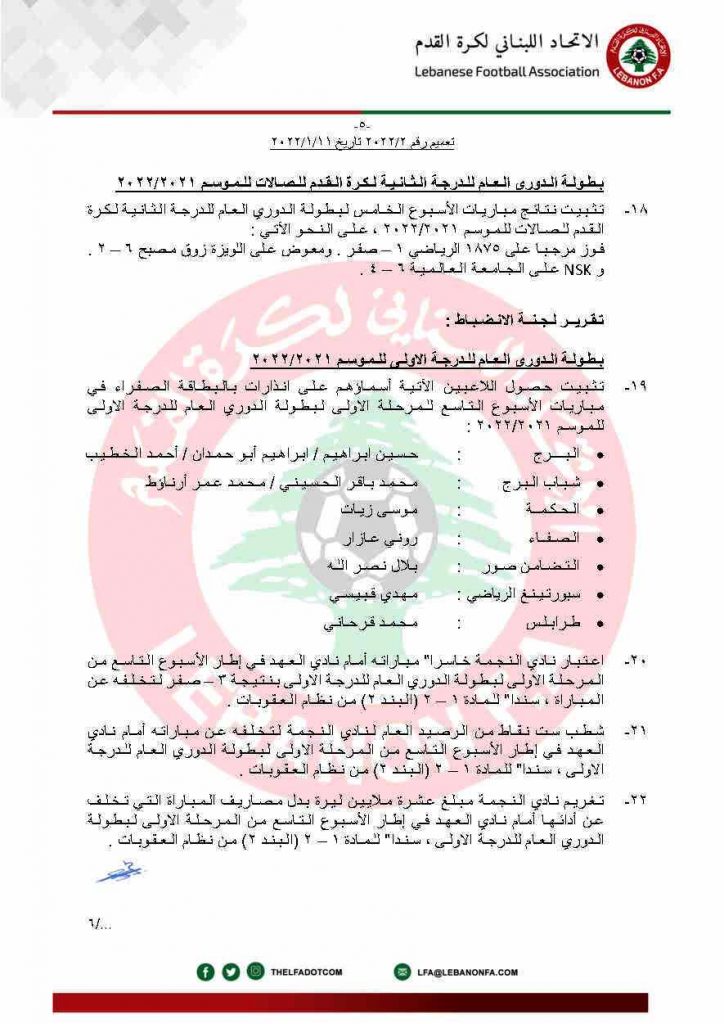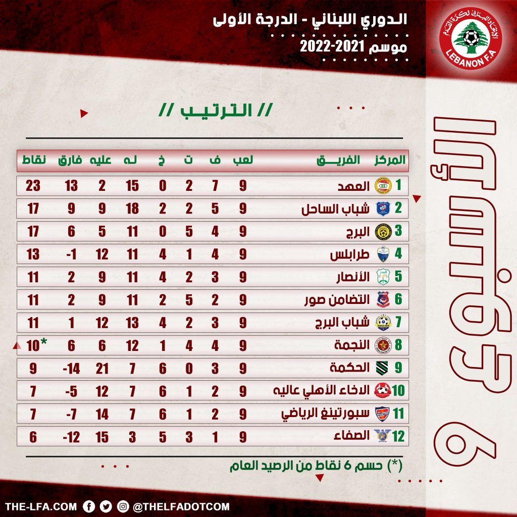 أصدر الإتحاد اللبناني لكرة القدم تعميماً اعتبر فيه نادي النّجمة خاسراً بنتيجة (3-0) وشطب ست نقاط من رصيده , وتغريمه 10 ملايين ليرة , بسبب تخلّفه عن الحضور لمباراته أمام العهد السبت الماضي في إطار المرحلة التاسعة من بطولة الدوري . كما نشر في تعميمه برنامج مباريات المرحلة العاشرة من بطولة الدّوري . وفي تعليقه على القرار , قال أسعد الصقّال رئيس نادي النجمة أنّ الإتحاد اللبناني نفّذ القانون بتخسيره المباراة , لكنه سيستأنف ضدّه , وسيسلّم طلبه اليوم إلى لجنة الإستئناف بهدف إعادة المباراة أمام العهد . وأكّد أنّه يثق في لجنة الإستئناف , وسيلتزم بقرار الإتحاد إلا أنّ المطلوب منه أن يضع حدّاً للأخطاء التحكيمية المتكرّرة . وختم صقّال بأنّه واثق من تحصيل حقوقه وتحسين الأمور في الدوري .