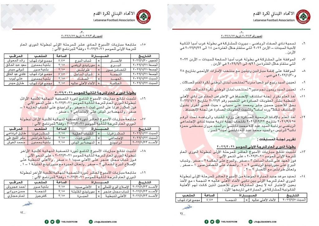 حدّد الإتحاد اللبناني لكرة القدم في اجتماعه الأسبوعي موعداً جديداً لمباراة النجمة والإخاء الأهلي عاليه المؤجّلة من المرحلة العاشرة من بطولة الدوري , في 5 شباط المقبل . وكان الإتحاد قرّر تأجيل المباراة بسبب الإصابات بفيروس كورونا التي طالت عدداً من لاعبي الفريقين , وضمن اجتماعه استنكر الإتحاد اللبناني حملة الشتائم التي طالت رئيس نادي العهد تميم سليمان وهنا التعميم :