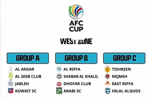 سُحبت أمس في مقر الإتحاد الآسيوي لكرة القدم قرعة بطولة كأس الإتحاد لمنطقة غرب ءاسيا التي يشارك فيها فريقا الأنصار والنجمة , وجاء الأنصار في المجموعة الأولى إلى جانب أندية السيب العُماني وجبلة السوري والكويت الكويتي . أما النجمة فحلّ في المجموعة الثالثة إلى جانب تشرين السوري والرفاع البحريني وهلال القدس الفلسطيني .
