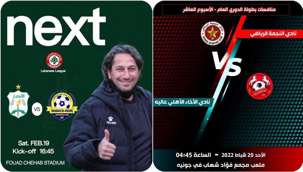 تُتابع بطولة الدوري اللبناني لكرة القدم بعد توقف حوالي شهر , فتُقام في الساعة 4.45 من عصر اليوم مباراة مؤجّلة من المرحلة الحادية عشرة بين شباب البرج والأنصار على ملعب فؤاد شهاب في جونية , وغداً مباراة مؤجّلة من المرحلة العاشرة بين الإخاء الأهلي عاليه والنجمة , على نفس الملعب .