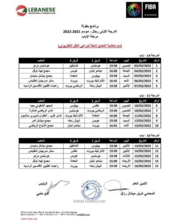 أعلن الإتحاد اللبناني لكرة السلّة متابعة برنامج مباريات مرحلة الإياب في بطولة الدّوري , بعد توقف لحوالي شهر بسبب مشاركة المنتخب في بطولة كأس العرب والتصفيات الآسيوية المُؤهِّلة لمونديال 2023 . وكان منتخب لبنان أحرز لقب بطل العرب لأوّل مرّة في تاريخه بفوزه على تونس في المباراة النهائية (72-69) , في البطولة ال24 التي استضافتها دبي الشهر الماضي . وخاض بعد ذلك مباراتين خارج أرضه ضمن النافذة الثانية لتصفيات المجموعة الآسيوية الثالثة المؤهِّلة لمونديال 2023 , فخسر في الأولى أمام الأردن بفارق 11 نقطة (63-74) وفاز في الثانية على السعودية بفارق 13 نقطة (81-68) . وتُفتتح المرحلة ال14 إياباً من بطولة لبنان غداً الخميس بمباراة الهومنتمن ضد الشانفيل , وتُختتم الإثنين بمباراة الرياضي بيروت متصدّر الترتيب وأنيبال زحلة الأخير , وفي أقوى مباريات المرحلة يحُلُّ بيروت ضيفاً على الأنترانيك يوم الأحد . وهنا البرنامج :