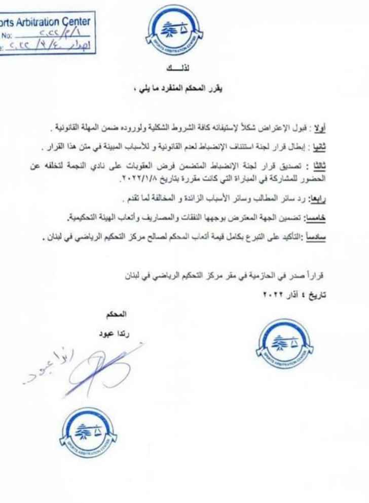 مركز التحكيم الرياضي يُبطل قرار لجنة الإستئناف بإعادة مباراة العهد والنّجمة , والتضامن صور يعود للمشاركة في دورة سداسي الأوائل بدلاً من النجمة .
