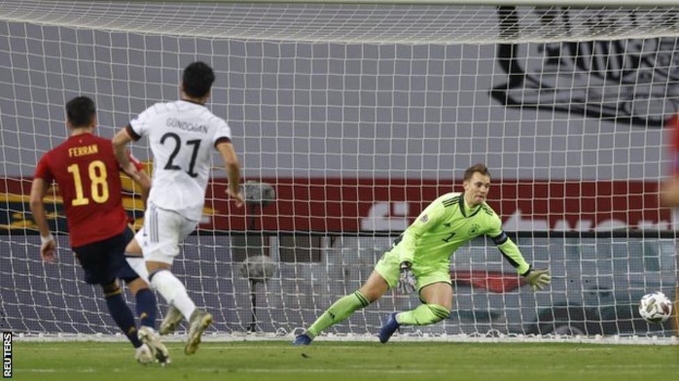 الإسباني فيرّان توريس يسجّل في مرمى ألمانيا في مباراة الفوز الكبير (6-0) .
