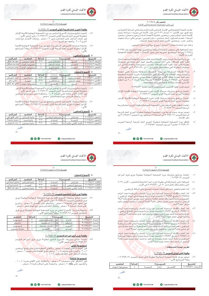 اتخذت اللجنة التنفيذية للإتحاد اللبناني لكرة القدم عدّة مقرّرات في جلستها الأسبوعية التي عقدتها أمس في مقرّ الإتحاد , برئاسة هاشم حيدر وحضور الأعضاء , وأبرز تلك المقرّرات : تهنئة منتخب لبنان للصالات لصعوده إلى نهائيات كاس ءاسيا المقرّرة في الكويت في 20/10/2022 , ومضاعفة مدّة إيقاف مدرّب النّجمة موسى حجيج إلى سنتين , وإقامة دعوى شخصية ضدّه , وجدّدت اللجنة يوم الأربعاء في 11/5/2022 موعداً لإقامة المباراة النهائية لبطولة كأس لبنان بين الأنصار والنّجمة على ملعب فؤاد شهاب في جونية . كما ثبتّت نتائج مباريات المرحلة الخامسة لدورتي سداسي الأوائل , وسداسي الأواخر . وفي ما يلي المقرّرات :