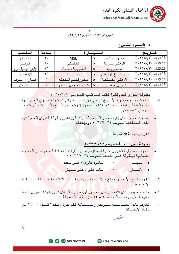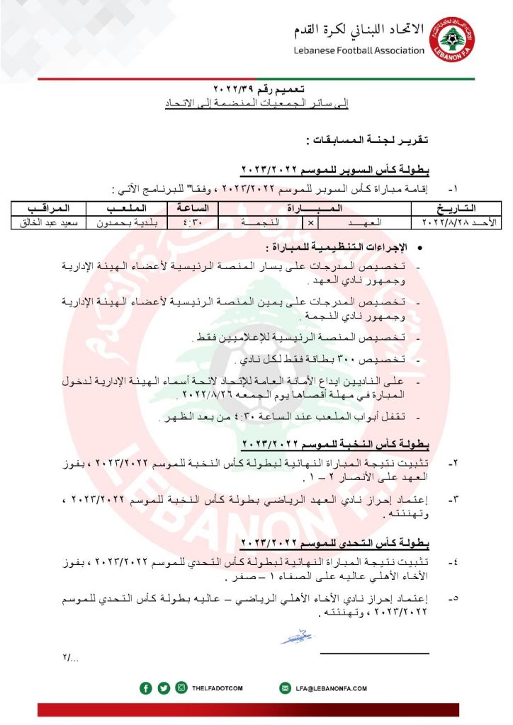 حدّدت اللجنة التنفيذية في الإتحاد اللبناني لكرة القدم خلال إجتماعها أمس الإجراءات التنظيمية لمباراة كأس السوبر بين العهد والنّجمة التي ستقام يوم الأحد المقبل في بحمدون , وغرّمت اللجنة ناديي الأنصار والعهد بعد الإشكالات التي حصلت السبت الماضي في المباراة النهائية لكأس النّخبة , والتي تضمنت هتافات عدائية متبادلة بين مشجعي الناديين سياسية ومذهبية طالت مسئولين دينيين وسياسيين . كما أوقفت اللجنة جمهور الأنصار مباراة واحدة .
