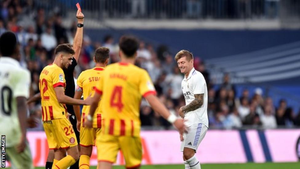 اكتفى ريال مدريد متصدّر الترتيب بالتعادل مع ضيفه جيرونا السادس عشر بنتيجة (1-1) , في المباراة التي أُجريت ليلاً على ملعب ريال سانتياغو بيرنابيو في ختام المرحلة ال12 من بطولة الدّوري الإسباني لكرة القدم . وتقلّص بذلك الفارق بين ريال ومنافسه المباشر برشلونة إلى نقطة بعد فوز الأخير خارج أرضه على فالنسيا (1-0) في افتتاح المرحلة أوّل من أمس . تقدّم ريال في الدقيقة 70 بواسطة البرازيلي فينيسيوس جونيور , ثمّ أدرك جيرونا التعادل بواسطة ستوياني من ركلة جزاء احتسبها الحكم في الدقيقة 80 بعد العودة إلى الvar الذي ضبط حالة لمسة يد على لاعب ريال أسنسيو داخل المنطقة . كما شهدت المباراة طرد لاعب الوسط طوني كروس في الوقت الضائع د1+90 , وهي أوّل مرّة يطرد فيها لاعب من ريال منذ مباراة ريال مدريد وبرشلونة في 10 نيسان 2021 .