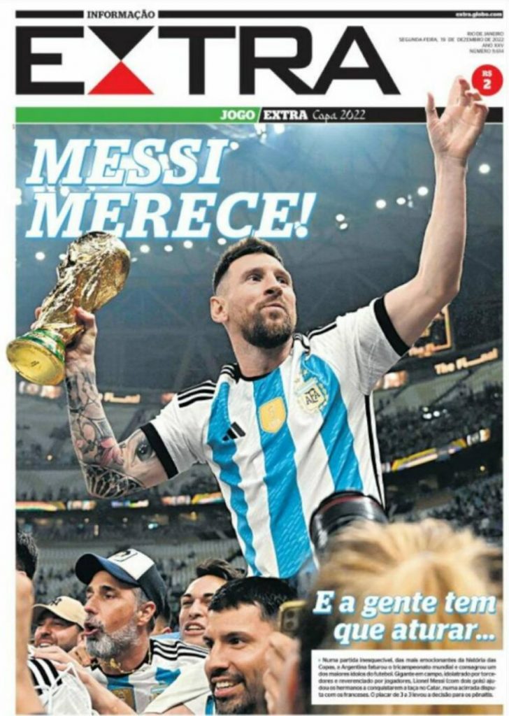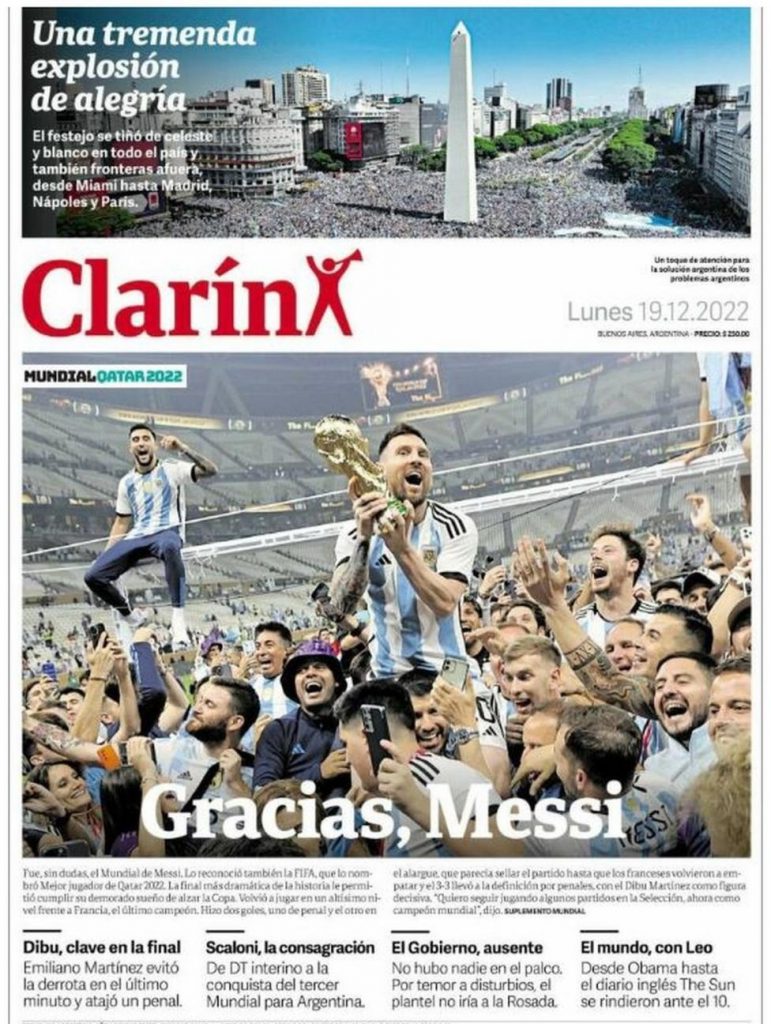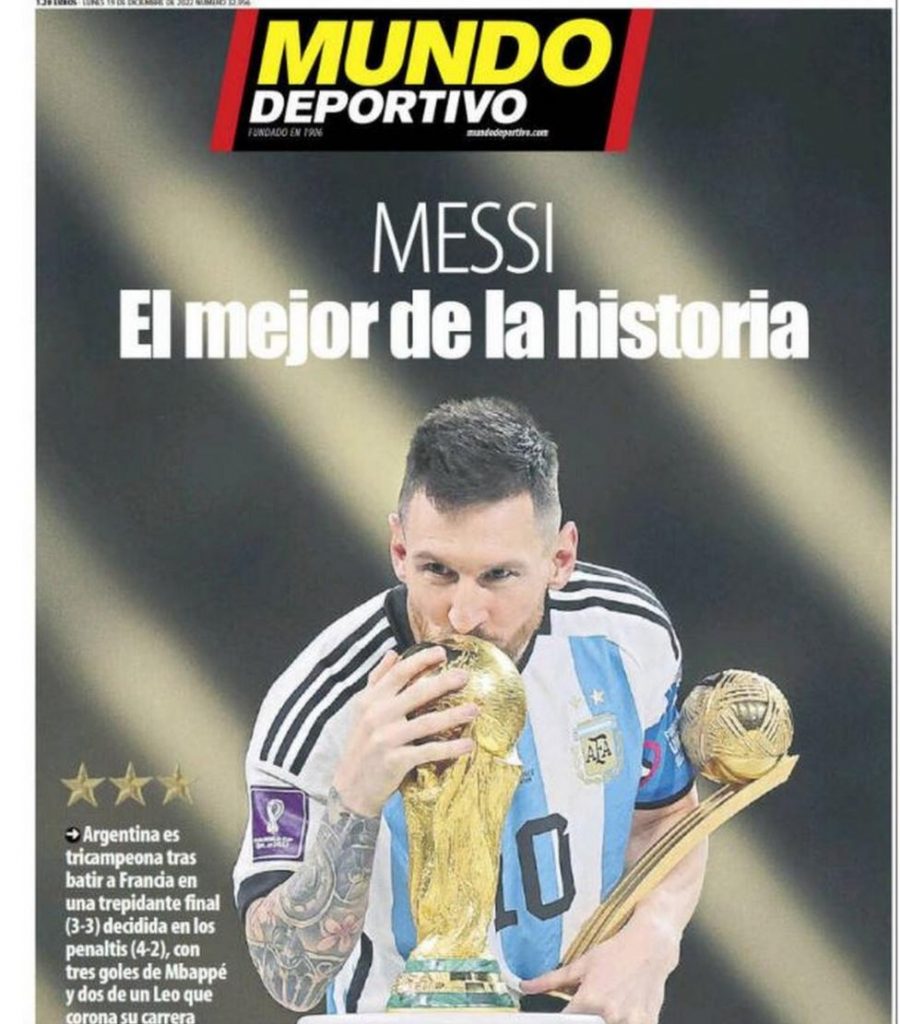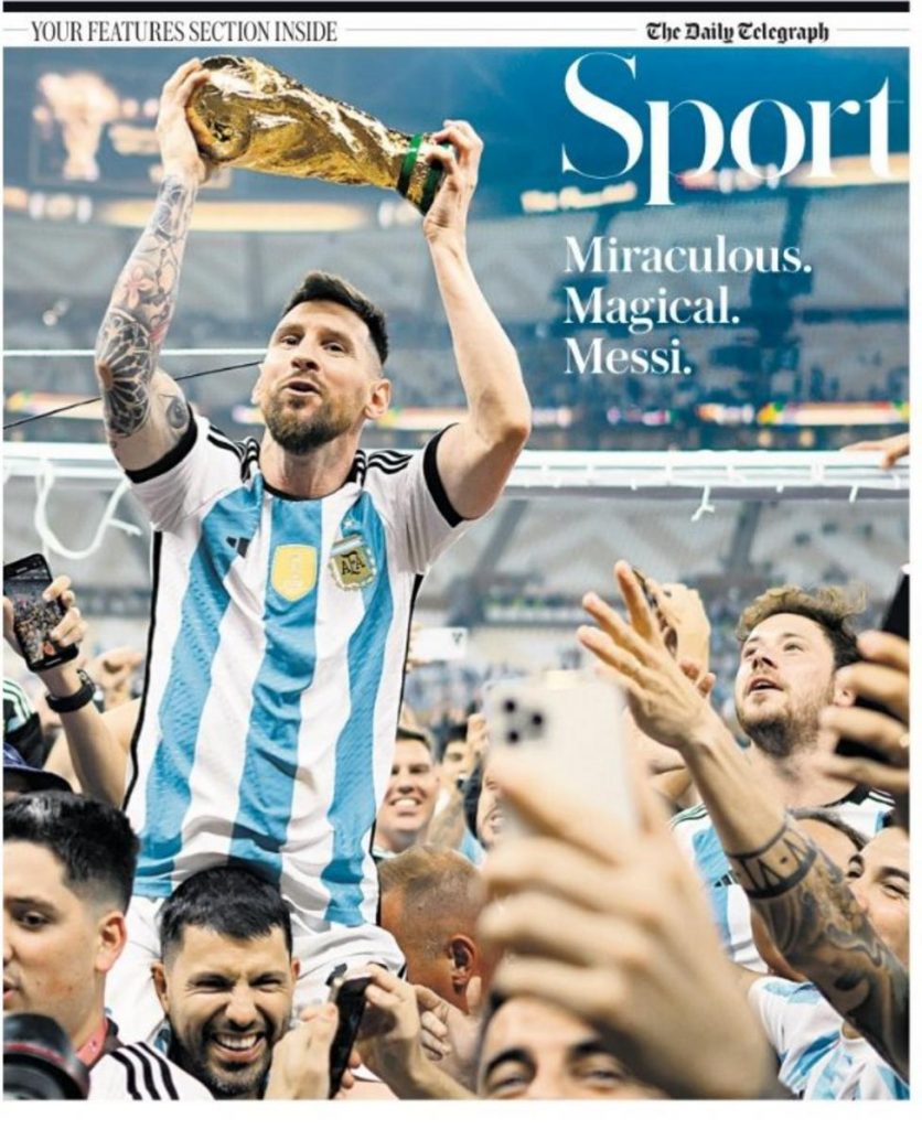 نورد في ما يلي ردود فعل الصحافة العالميية في عناوينها الرئيسية عقب فوز النّجم الأرجنتيني ليونيل ميسي مع منتخب بلاده ببطولة كأس العالم لكرة القدم في قطر , للمرّة الثالثة في تاريخ الأرجنتين .