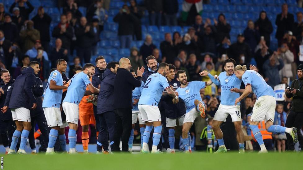 هالاند يتلقى تهنئة من المدرّب غوارديولا ولاعبي مانشستر .