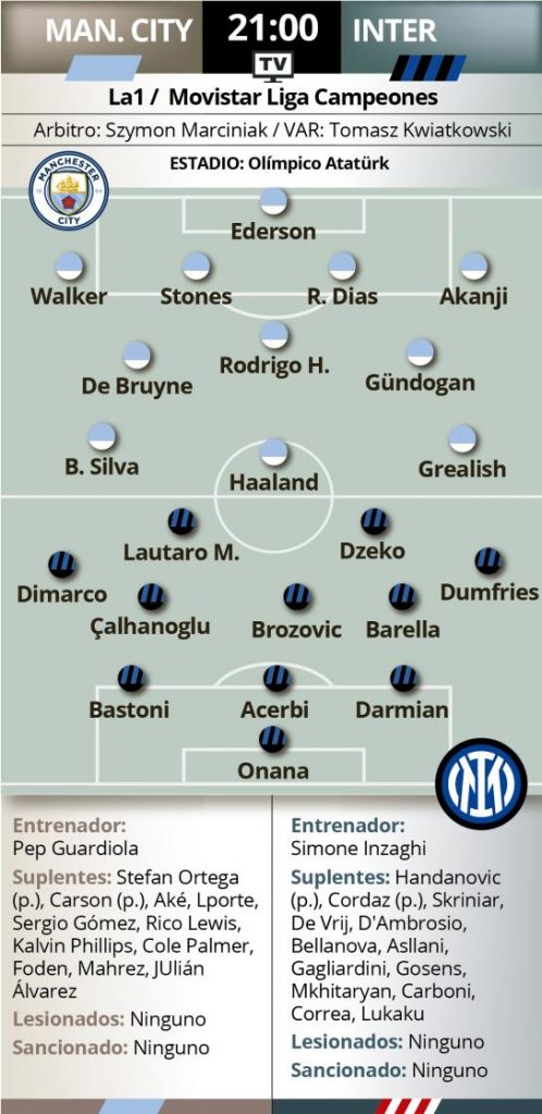 بستضيف ملعب اتاتورك في العاصمة التركية إسطنبول , نهائي دوري أبطال أوروبا في كرة القدم الذي يجمع بين فريقي مانشستر سيتي وإنتر ميلان , في الساعة 22.00 بتوقيت بيروت . وإذا ما كانت الترشيحات تصبّ في جانب مانشستر سيتي , الذي حقّق الثنائية الدّوري والكأس في إنكلترا هذا الموسم , معتمداً على مجموعة من النّجوم أمثال البلجيكي دو بروني والبرتغالي برناردو سيلفا والألماني غوندوغان ونجم الهجوم الفنلندي إرلنغ هالند , الذي سجّل 52 هدفاً في 52 مباراة في مختلف المسابقات هذا الموسم , غير أنّ المدقّقين لا يقلّلون من حظوظ إنتر ميلان في الفوز باللقب , فالفريق يضم خط دفاع صلب لم يتمكّن بورتو في دور ال16 ولا آسي ميلان في الدّور النّصف نهائي من اختراق سدّ دفاعي على الطريقة الإيطالية التقليدية , مكوّن من خمسة لاعبين : كالهانوغلو , بروزوفيتش , باريلا , دارميان , باستوني , يحيطون بالمخضرم فرانشيسكو آتشيربي (35 عاماً) ومن ورائهم الحارس الكاميروني المتألّق أندريه اونانا . وفي المؤتمر الصحفي قبل المباراة , قال سيموني إينزاغي مدرّب الإنتر : ندرك قوّة مانشستر سيتي , والقدرة التي يتمتّع بها هالاند على التهديف , لقد وضعنا خطة لتعطيله لكنّنا لن نتغاضى عن بقية اللاعبين . نعلم ماذا ينتظرنا , سنواجه أقوى فريق حالياً لم يخسر إلا قليلاً , ونعلم أيضاً ماهو المطلوب أن نفعله , ولكن على طريقتنا .