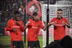 لاعبو رين الفرنسي يحتفلون بالفوز .