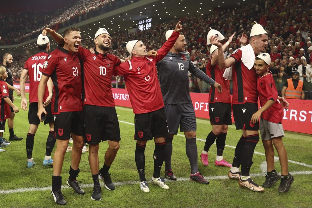 لاعبو ألبانيا يحتفلون بالصعود إلى بطولة ال ’’ يورو 2024 ’’ .