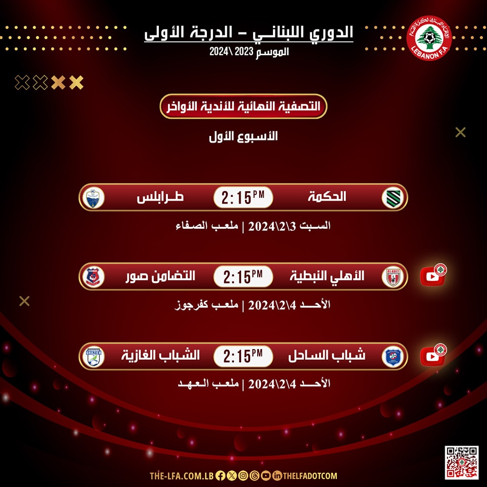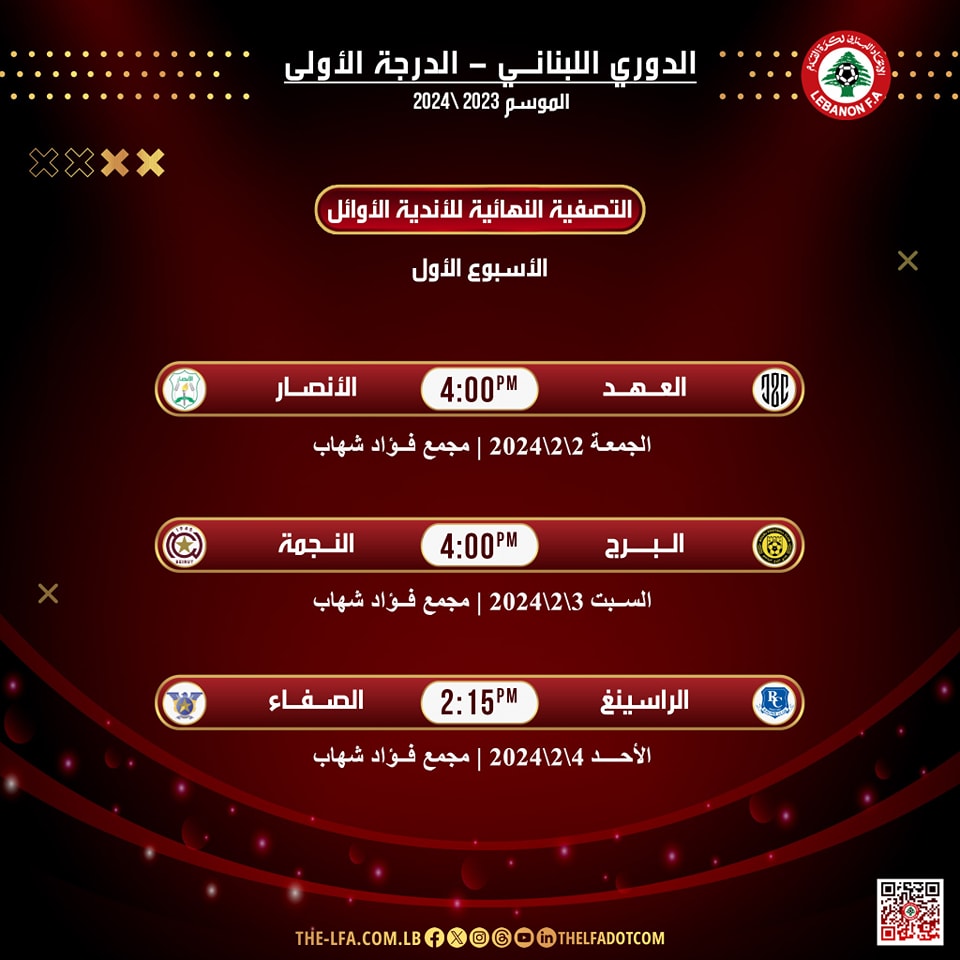 تنطلق في الرابعة من عصر اليوم على ملعب فؤاد شهاب في جونية , الجولة الأولى من دورة سداسي الأوائل لبطولة الدّوري اللبناني لكرة القدم , بمباراة الأنصار والعهد . واستعد الفريقان جيدًا لهذه المواجهة , فقام الأنصار بإجراء تغيير جذري في جهازه الفني مع قدوم المدرب يوسف الجوهري واستبدال لاعبيه الأجانب , الذين خيّبوا الآمال في الدّور الأول , بضمّ الثلاثي المهاجم الجزائري هشام خلف الله , ولاعب الوسط المصري عبد الله ياسين والمدافع المالي العائد إيشاكا ديارا إلى جانب هدّافه السنغالي حاج مالك تال . بدوره قام العهد باستبعاد المدافع الأردني محمد أبو حشيش واستقدام الظهير الأيسر السوري ضياء الحق المحمد من نادي الفتوة , ولاعب الوسط السابق في فريق النجمة كريم أبو زيد الذي بدأ مسيرته الكروية من كرة الصالات . وكان العهد أنهى الدّور الأول في المركز الثاني بفارق المواجهات عن النّجمة , في حين حلّ الأنصار في المركز الرابع بفارق نقطة عن البرج . وبحسب النّظام الجديد المعتمد هذا الموسم , يلعب كل فريق خمس مباريات في خمس جولات على ثلاث مراحل , بخلاف الموسمين السابقين (مرحلة واحدة بخمس جولات) . وغدًا السبت تنطلق دورة سداسي الأواخر في الصراع للهروب من الهبوط إلى الدرجة الثانية , بمباراة طرابلس والحكمة . ونذكر هنا برنامج الجولة ألأولى في الدّورتين :