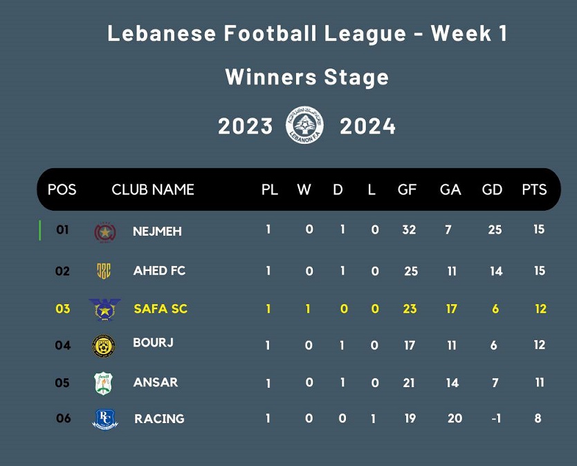 كان فريق الأنصار الخاسر الأكبر في ختام مباريات الأسبوع الأول من دورة سداسي الأوائل في بطولة الدوري اللبناني لكرة القدم . وذلك بعد فوز الصفاء على الراسينغ السادس الأخير بهدف وحيد سجّله خالد تكه جي في الدقيقة 71 , في المباراة التي أُجريت أمس على ملعب فؤاد شهاب في جونية في ختام الجولة . وبهذا الفوز صعد فريق الصفاء إلى المركز الثالث , تاركًا المركز الخامس للأنصار . وفشل النّجمة في استغلال تعثر العهد , بالتعادل (1-1) مع الأنصار في افتتاح الجولة أوّل من أمس , والإنفراد بالصدارة , إذ تعادل بدوره من دون أهداف مع البرج الذي تراجع إلى المركز الرابع . ونذكر هنا الترتيب :